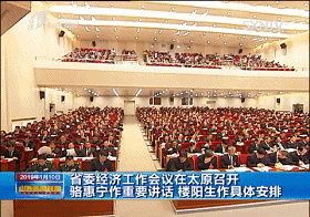 1月9日至10日,省委经济工作会议在太原召开。省委书记骆惠宁作重要讲话。会议以习近平新时代中国特色社会主义思想为指导,深入贯彻党的十九大和习近平总书记视察山西重要讲话精神,深入贯彻中央经济工作会议和省委十一届六次、七次全会精神,总结2018年经济工作,分析当前经济形势,部署2019年经济工作。省委副书记、省长楼阳生作具体安排,并作总结讲话。